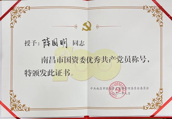 在隆重紀(jì)念中國共產(chǎn)黨成立100周年之際,南昌市國資委和南昌旅游集團于近日對一批來自各條工作戰(zhàn)線上的優(yōu)秀黨員和優(yōu)秀黨務(wù)工作者及先進基層黨組織進行了表彰,獎勵他(她)們在各自的工作崗位上履職盡責(zé)創(chuàng)先進、立足崗位爭優(yōu)秀,在推動企業(yè)高質(zhì)量發(fā)展中充分發(fā)揮戰(zhàn)斗堡壘和先鋒模范作用。其中,公司陳國明同志榮獲市國資委“優(yōu)秀共產(chǎn)黨員”稱號,公司黨委被評為南旅集團“先進基層黨組織”,黨員職工胡穎明、徐小蘭、王昕、王貞同志獲南旅集團“優(yōu)秀共產(chǎn)黨員”稱號。