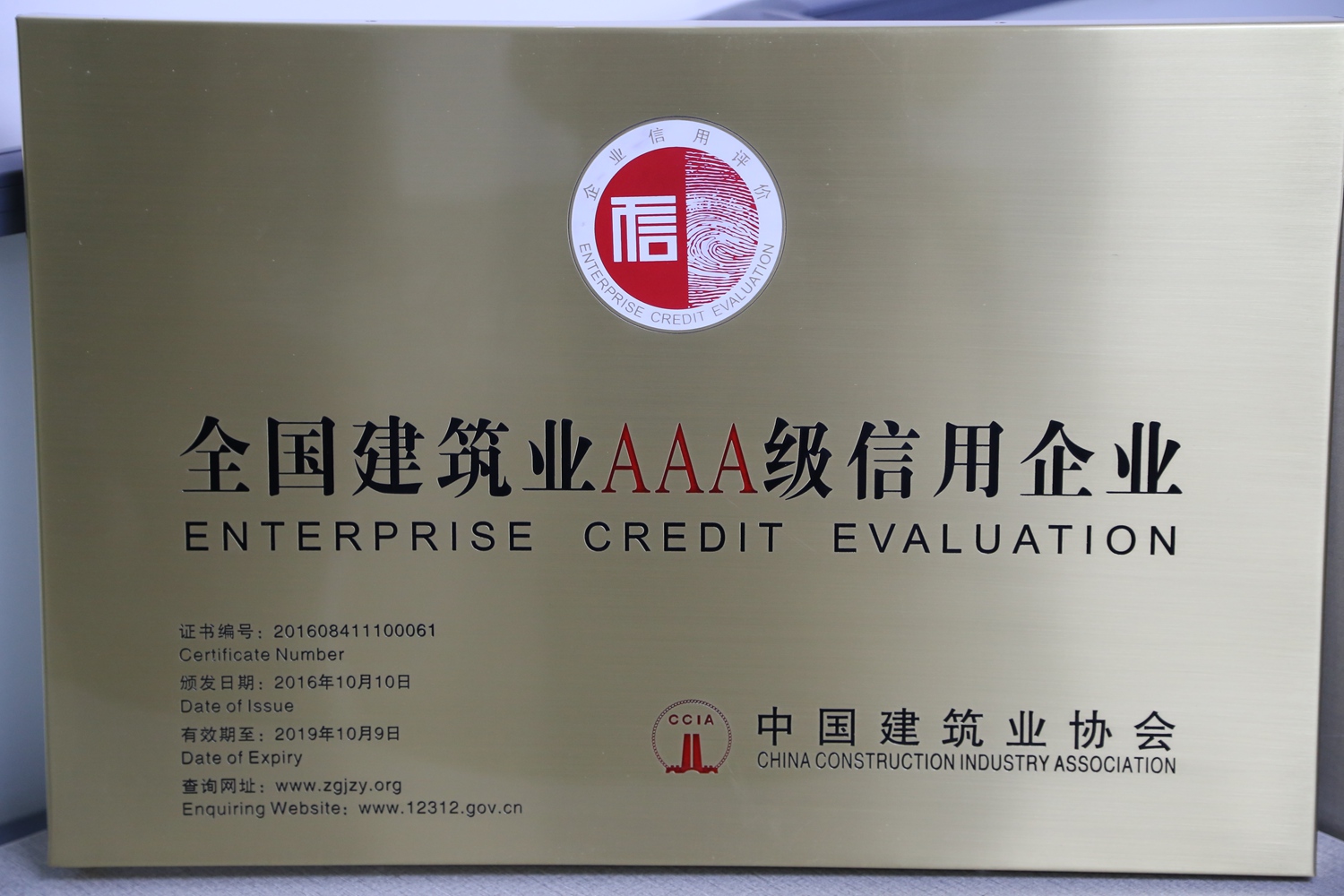 企業(yè)信用等級是由中國建筑業(yè)協(xié)會經(jīng)審核、篩選和評定而確定的,有效期3年,每年復(fù)審一次。由于公司一直本著誠信、服務(wù)、質(zhì)量為上的原則,獲得了中國建筑業(yè)協(xié)會及社會大眾的認可,2016年10月公司再度榮獲“AAA級信用企業(yè)”的榮譽稱號。這個全國建筑行業(yè)都為數(shù)不多的榮譽是對我們企業(yè)的肯定及嘉獎,讓我們樹起信譽旗幟,再創(chuàng)輝煌,攜手走得更好、更遠。